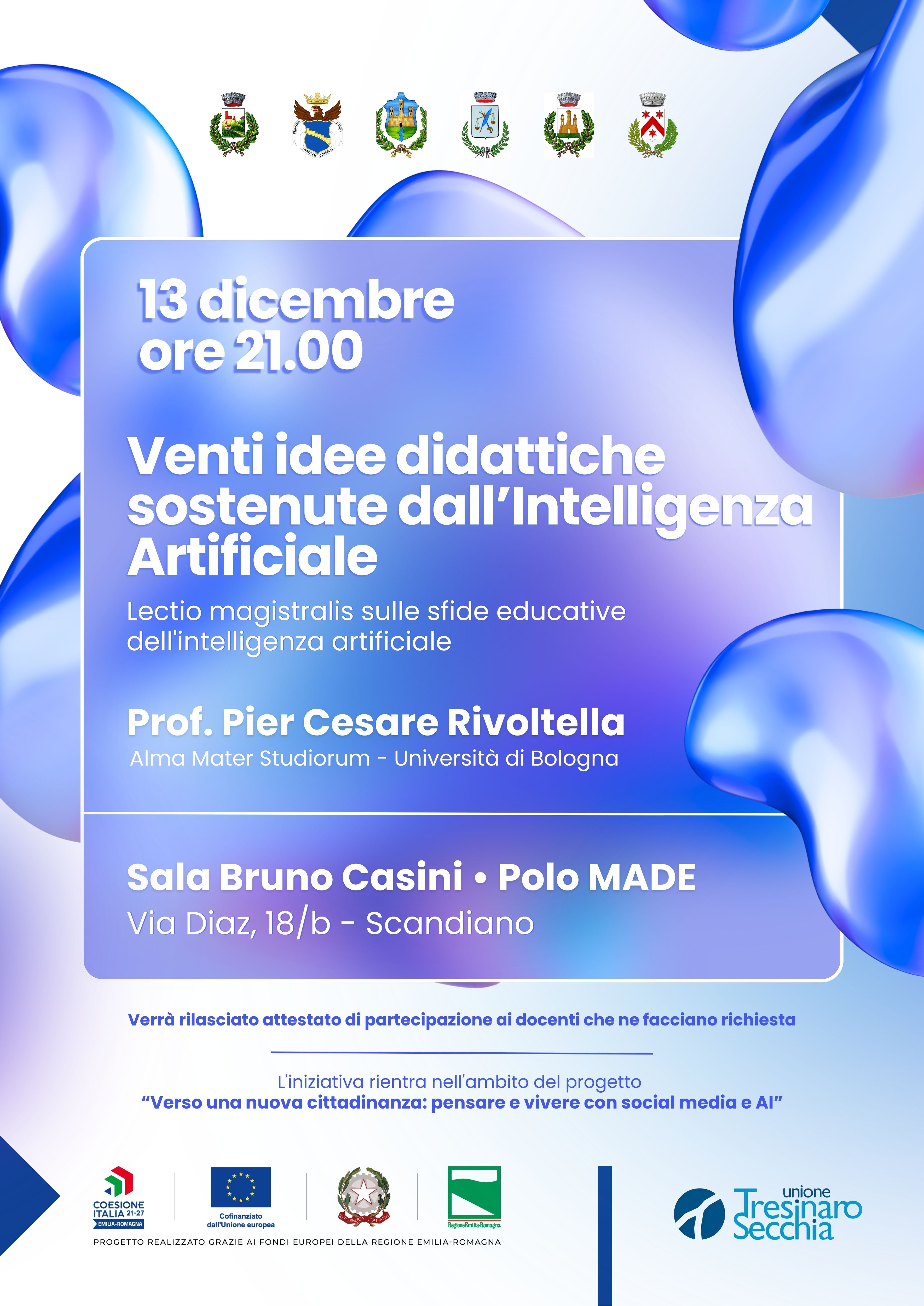 Nell'ambito del progetto "Verso una nuova cittadinanza: pensare e vivere con social media e AI" - venerdì 13 dicembre, alle ore 21, presso la Sala Casini del Polo MADE (Via Diaz 18/b) - si terrà la lectio magistralis del Prof. Pier Cesare Rivoltella (Alma Mater Studiorum - Università di Bologna) sulle sfide educative dell'Intelligenza Artificiale.